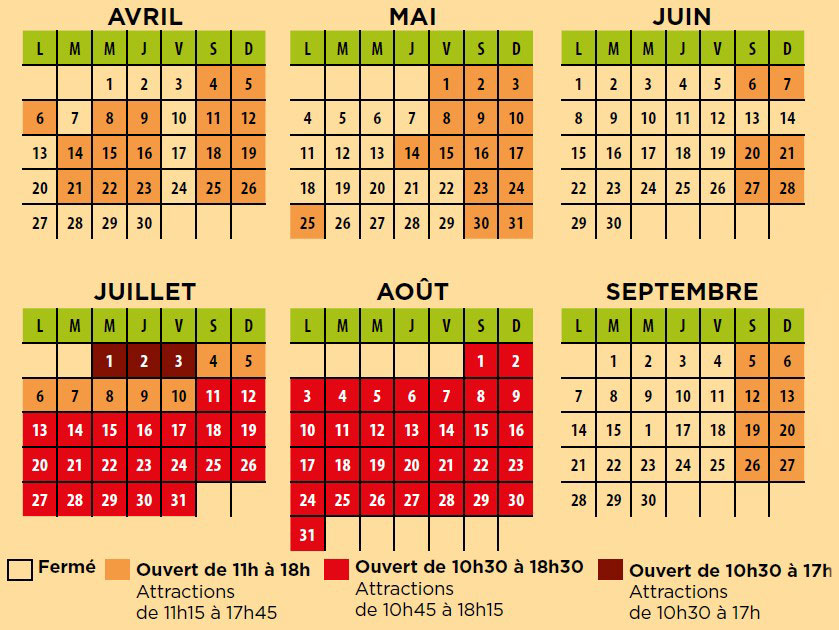 Le Parc de la Vallée est ouvert d’Avril à Septembre. Selon les dates indiquées ci-dessous. Des modifications peuvent-être apportées en cours de saison. Les dates et horaires peuvent varier en cas d’intempéries.